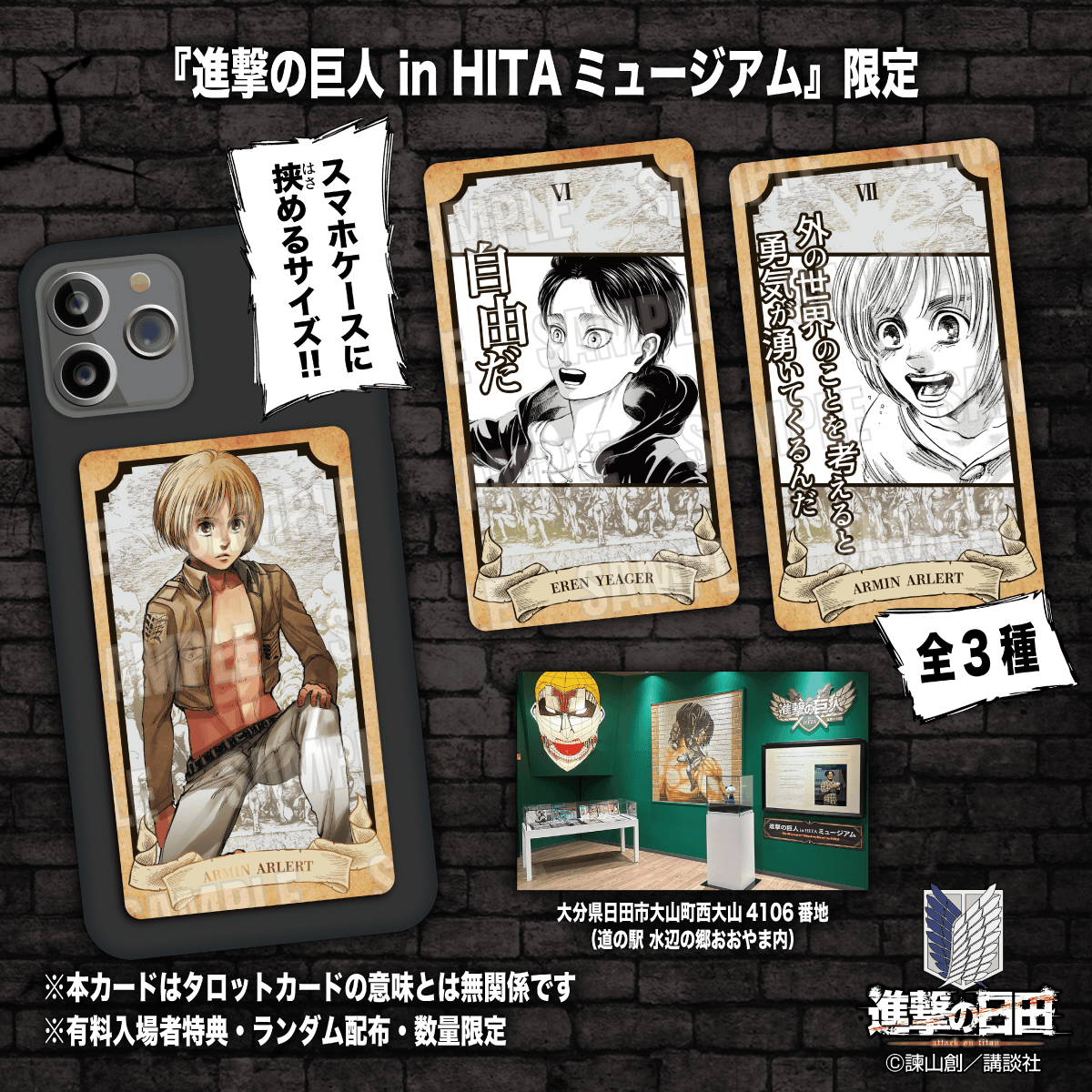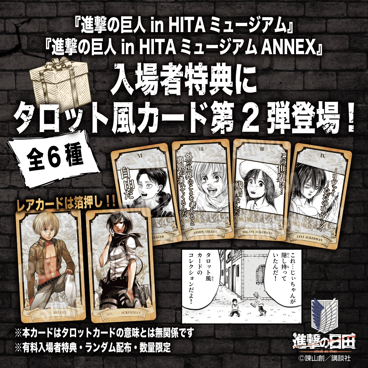これを記念し、「進撃の巨人 in HITA ミュージアム」の有料入場者特典に、「諫山創セレクト原画 新展示」キービジュアルを用いたポストカードが新登場!(数量限定・なくなり次第終了)